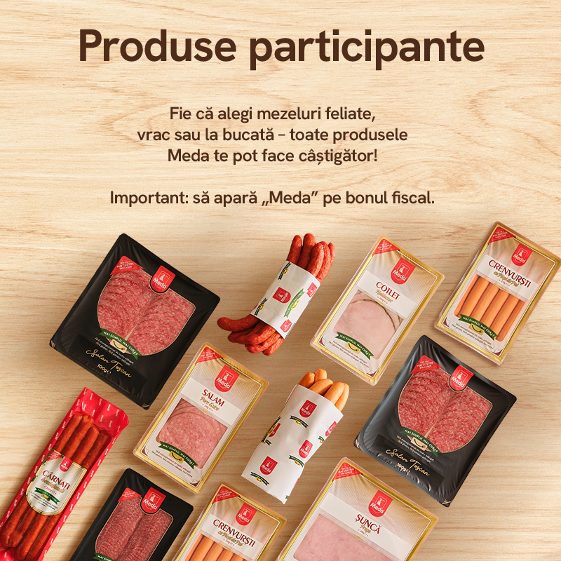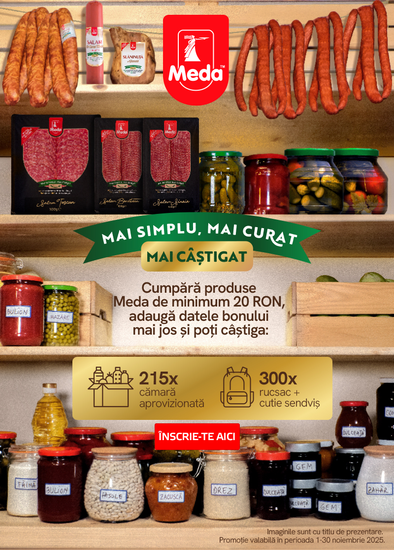Cumpără în perioada 01 – 30 noiembrie 2025 orice produs Meda indiferent de gramaj sau formă de comercializare în valoare de minim 20 lei, dintr-unul din magazinele participante din comentul traditional* și înscrie bonul aici, pe site.